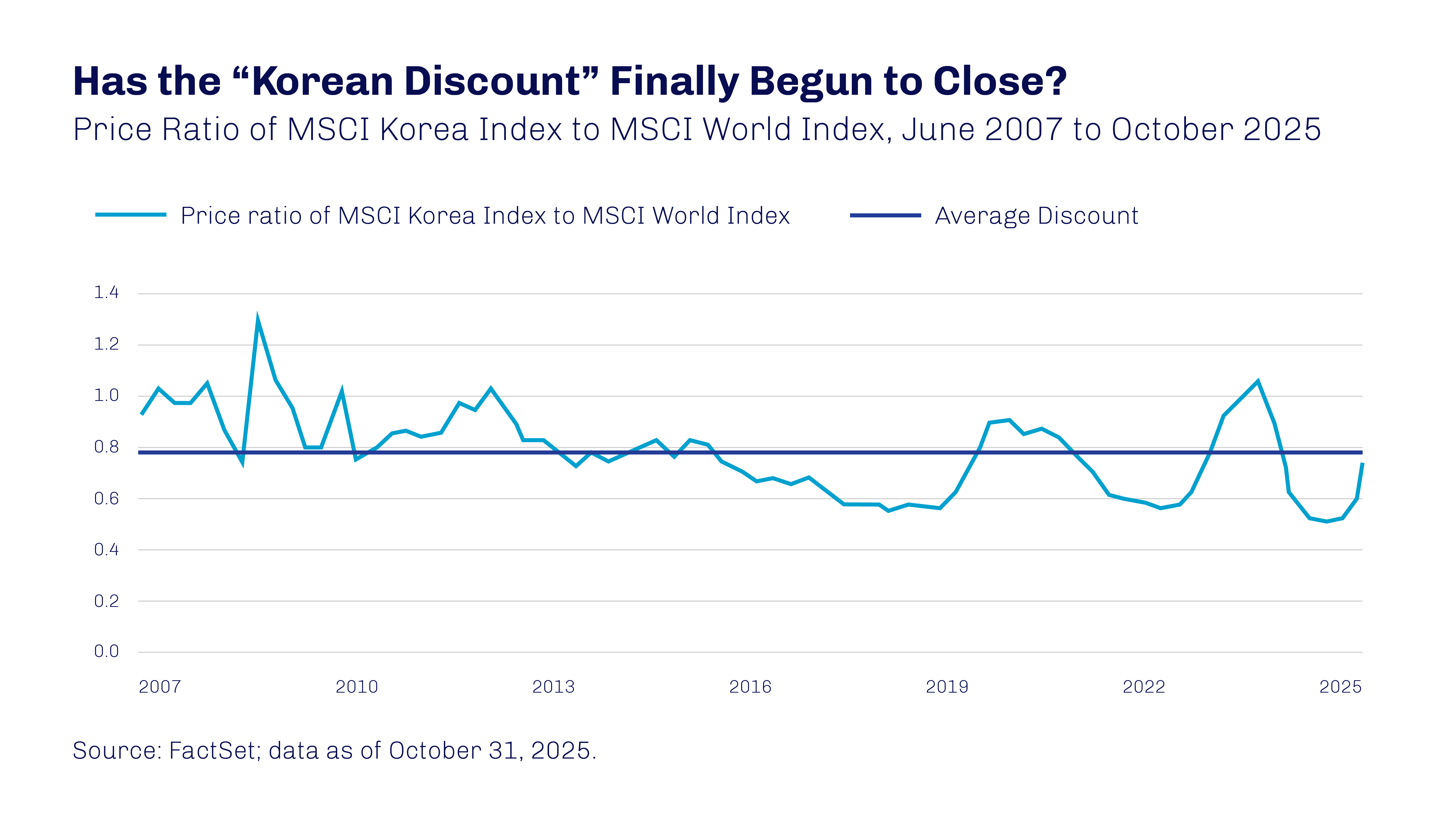 Fueled by a variety of other factors like growing investments in artificial intelligence and the recently announced trade deal between the US and Korea, the MSCI Korea Index has been a standout performer with an 84% gain in year-to-date 2025.1 While the “Korean discount” is still below its long-term historical average, it has begun to narrow this year. We remain cognizant of risks and challenges, and, as a result, we believe that selectivity in this market is paramount. With a track record of three decades of investing in Korea, we have observed that the country’s corporate focus on innovation in high-end precision manufacturing has contributed to a high density of world-class enterprises, including high-quality global companies with strong management teams and a qualified manufacturing base.2