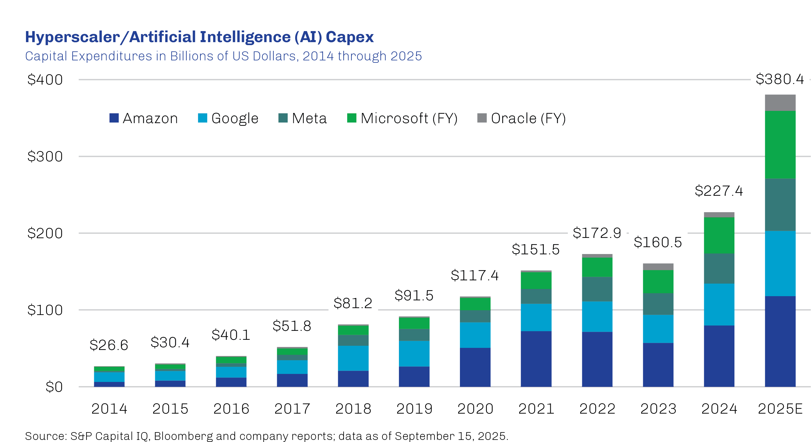 Behind the scenes, this transformation demands extraordinary investment. The technology companies driving large-scale AI deployment—often referred to as hyperscalers—are committing unprecedented and increasing amounts of capital toward data centers, computing power and digital infrastructure. Reflecting this broader trend, capital expenditure (capex) among hyperscalers is projected to accumulate to roughly $400 billion by 2025 year-end.1