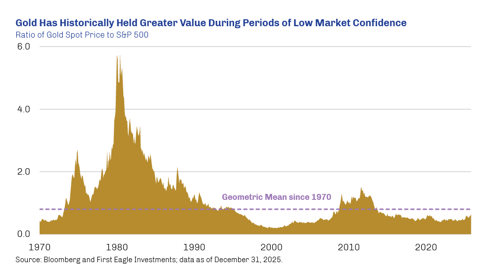 As the dark clouds of complacency accumulate, we seek ballast across assets that provide different layers of resilience. We continue to highly value the strategic hedge potential of gold given the fiscal and geopolitical dynamics currently in place. The monetary value of gold has been reasserting itself as the gold price has increased significantly over the past two years. We note that this rally has merely aligned gold with its 50-year geometric average relative to the stock of US public debt while bringing it closer to its geometric average versus the S&P 500 Index. Gold has historically been worth more than equities during periods of low confidence in markets, and it has been getting closer to its historical average relative to the S&P 500, as seen in the chart below.3