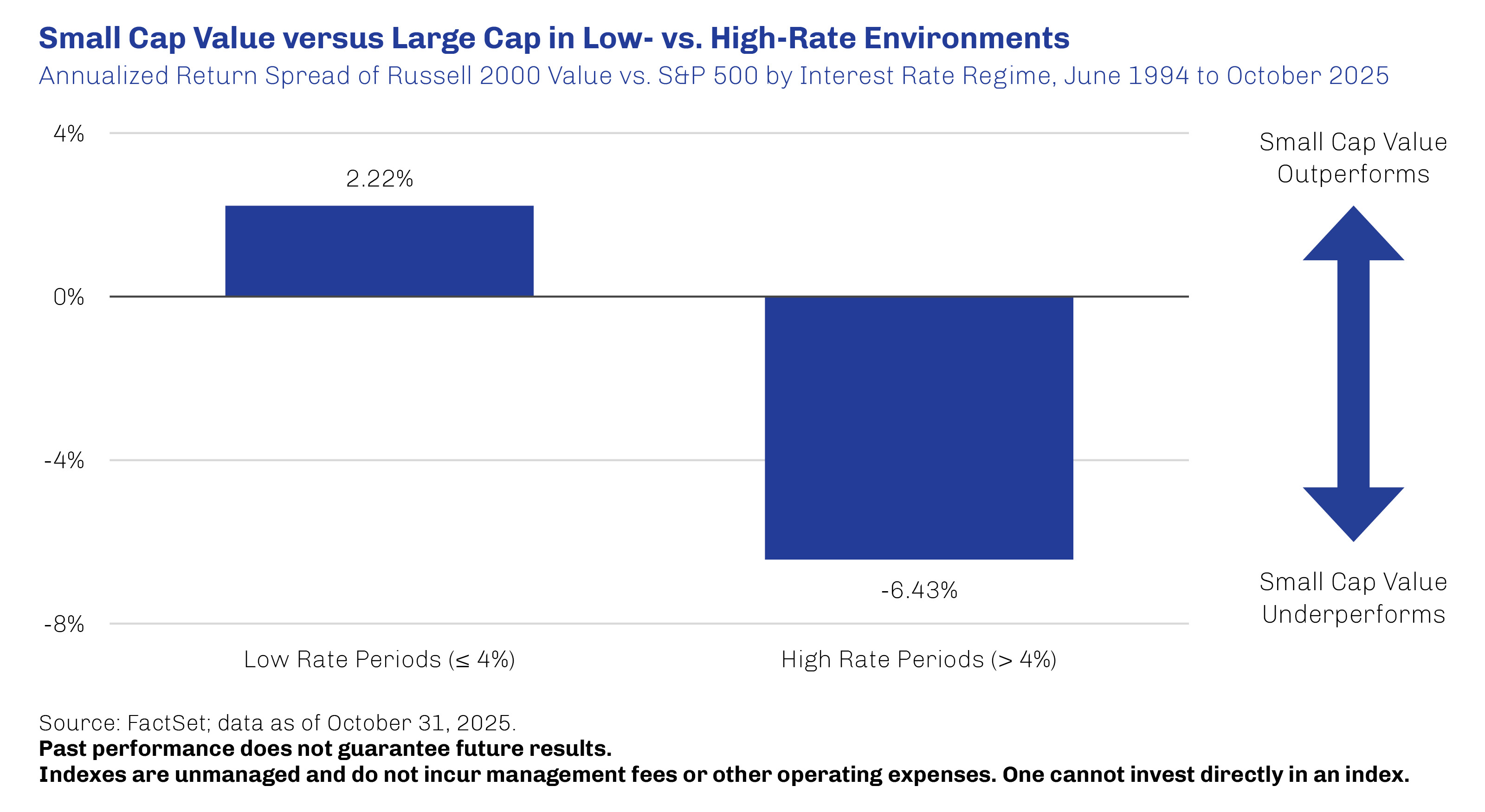 Historical data show that when interest rates are at or below 4%, small cap value stocks outperform large caps by an average of just over 2% annually. In contrast, when rates rise above 4%, we see small cap lag by over 6% annually.2
