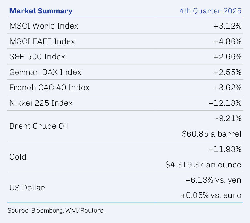 While the threats to market stability that have prevailed throughout the year were undiminished during the quarter, investors continued to embrace risk. The S&P 500 Index gained 2.7% for the fourth quarter and 17.9% for the year, while the MSCI EAFE Index returned a respective 4.9% and 31.2%, Notably, 2025 was only the third year in the past 10 that the MSCI EAFE has outperformed the S&P 500. Gold, meanwhile, surged 65% during the year, its largest annual return since 1979.1