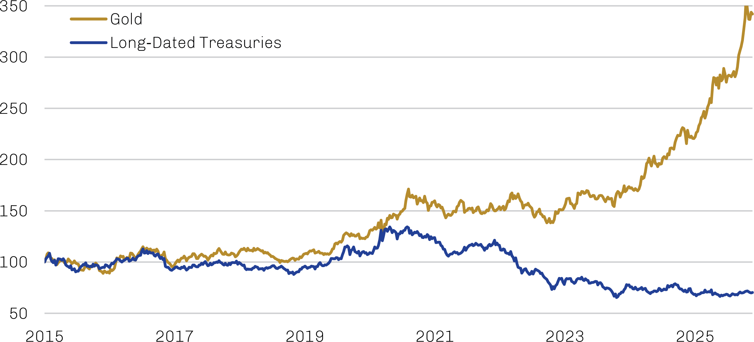 Beyond ideology, this shift is being expressed in monetary behaviors. Since the West froze Russia’s official foreign reserves following its 2022 invasion of Ukraine, a range of countries—driven by concerns about the potential weaponization of their reserve assets—have diversified their holdings, primarily by increasing their allocations to gold. Gold purchases by global central banks have exceeded 1,000 tonnes in each of the past three full years after reaching only 450 tonnes in 2021, and purchases are on track for the high triple digits in 2025.7 As a result, gold holdings as a share of foreign reserves now exceed Treasuries for the first time in 30 years.8 Steady central bank buying also has helped support the price of gold, which— unusually—has rallied alongside equities, more than doubling in price since the beginning of 2024.9