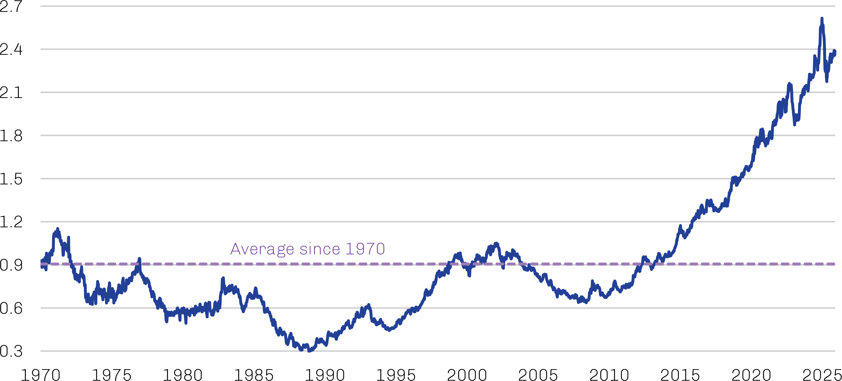 Despite the strong performance of non-US equities thus far in 2025—the MSCI World ex USA Index has gained 25.8% through November-end compared to 17.8% for the S&P 500—the price ratio of US stocks to non-US names is well more than double the long-term average, as shown in Exhibit 4, suggesting that some degree of latency remains in non-US markets. The US equity market is trading at around 25x earnings, which is equivalent to a 4% earnings yield, while non-US markets are at 16x earnings, or about a 6% yield.10 Unless US productivity growth can account for that 2% spread, global diversification appears compensatory on valuation alone.