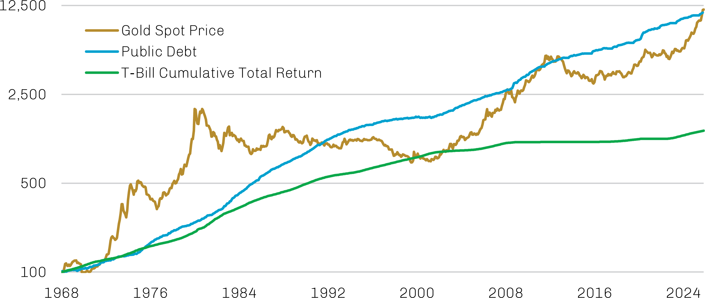 Exhibit 5 serves as a good example of how this dynamic has played out over time. The cumulative return of short-term Treasuries has climbed steadily throughout the measurement period with little price volatility, which should not come as a surprise for an asset with a fixed coupon, fixed principal and theoretically zero risk of default. But this return significantly lags the supply growth of Treasuries, as represented by the stock of public debt. Which is to say that the real value of these Treasury returns has eroded over the long term as more and more debt was issued. In contrast, a fixed-positional asset like gold, while volatile in nominal terms, has kept pace with the growth of government debt outstanding, delivering a far stronger real return compared with Treasuries.