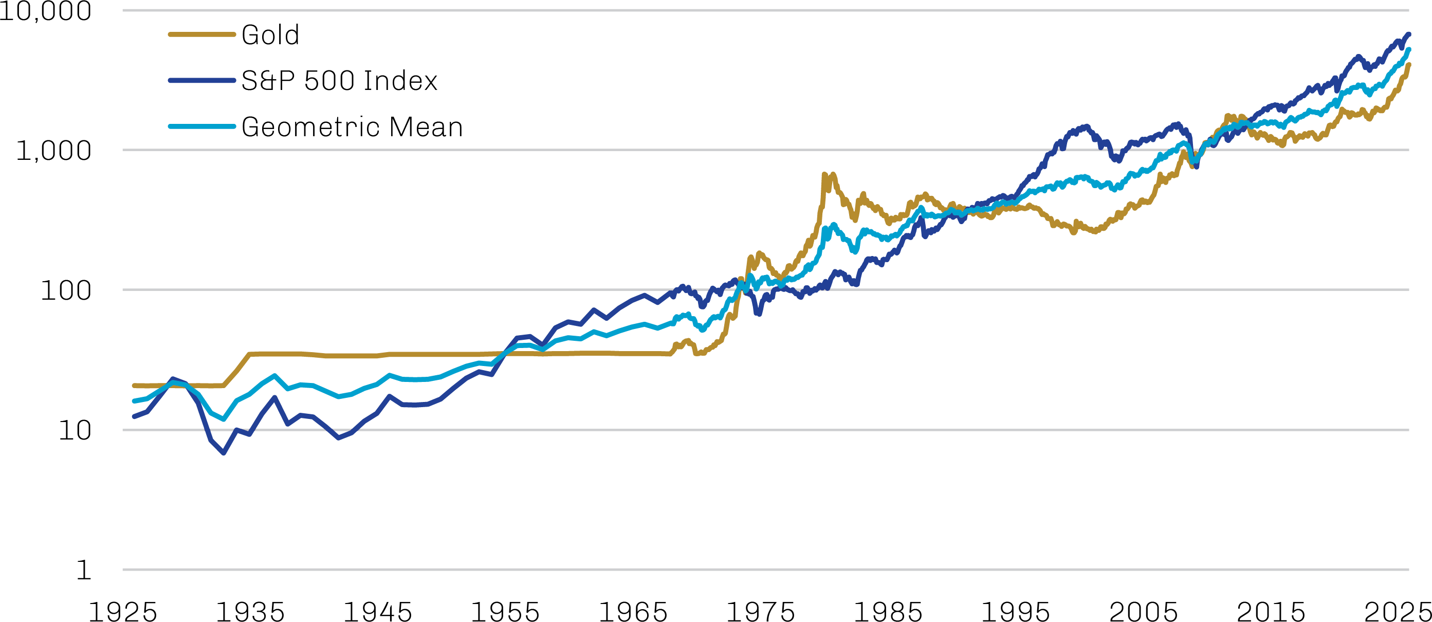 Gold Spot Price and S&P 500 Index, Logarithmic Scale