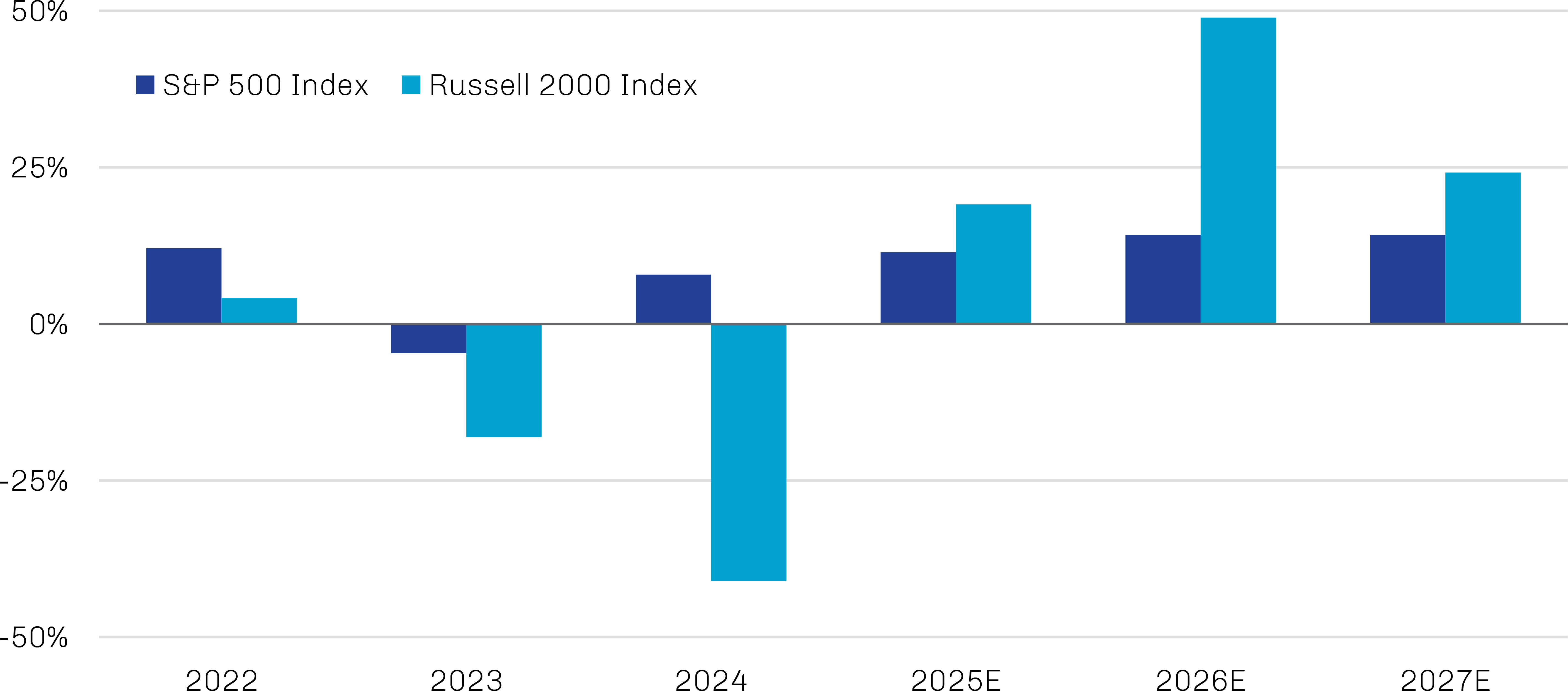 As shown in Exhibit 1, earnings for the Russell 2000 Index are forecast to outpace those of the S&P 500 Index through at least 2027. Even without multiple expansion, earnings growth alone can propel small cap performance.