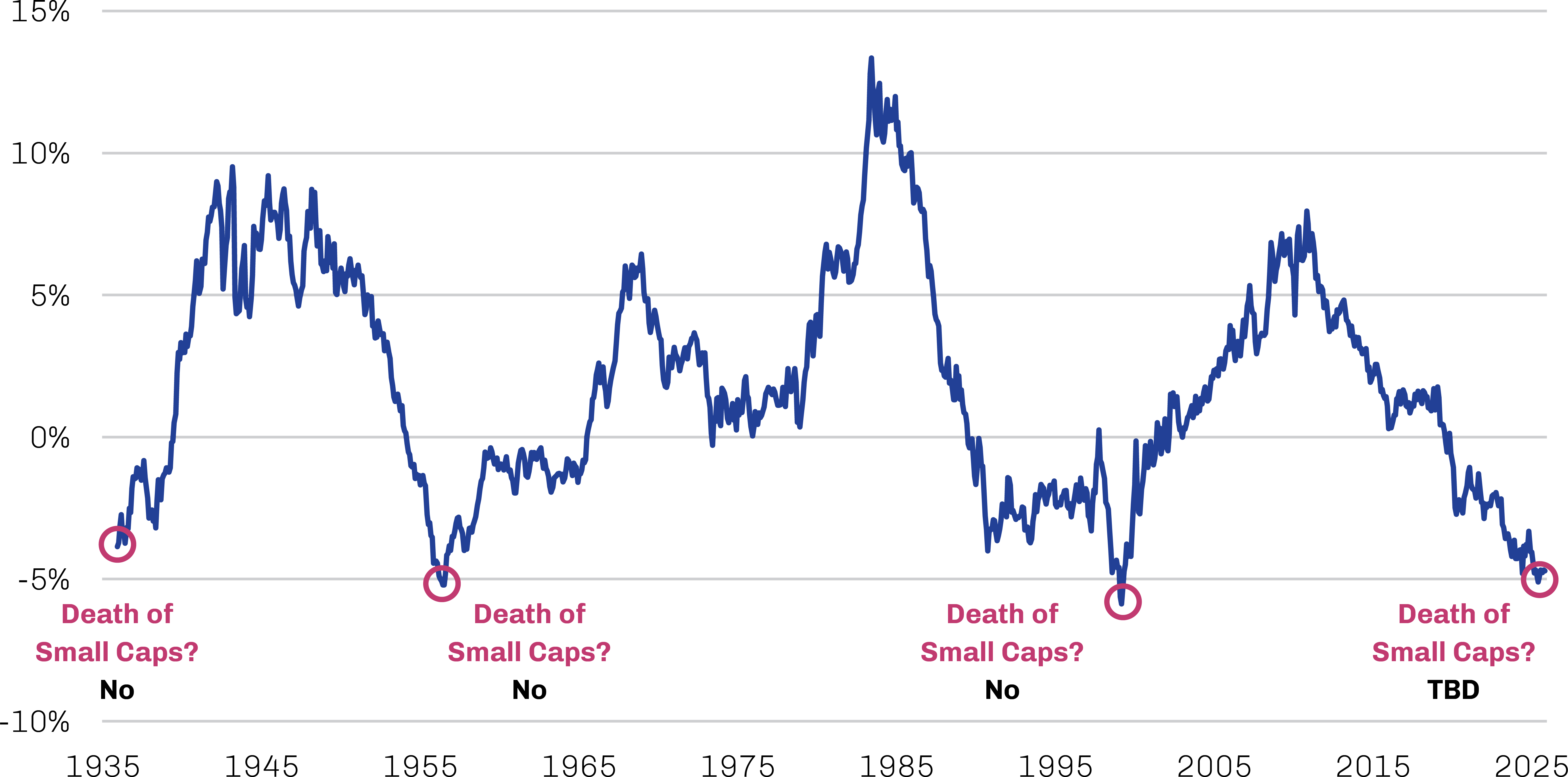 Relative Trailing 10 Year Annualized Returns, Russell 2000 Index Less S&P 500 Index