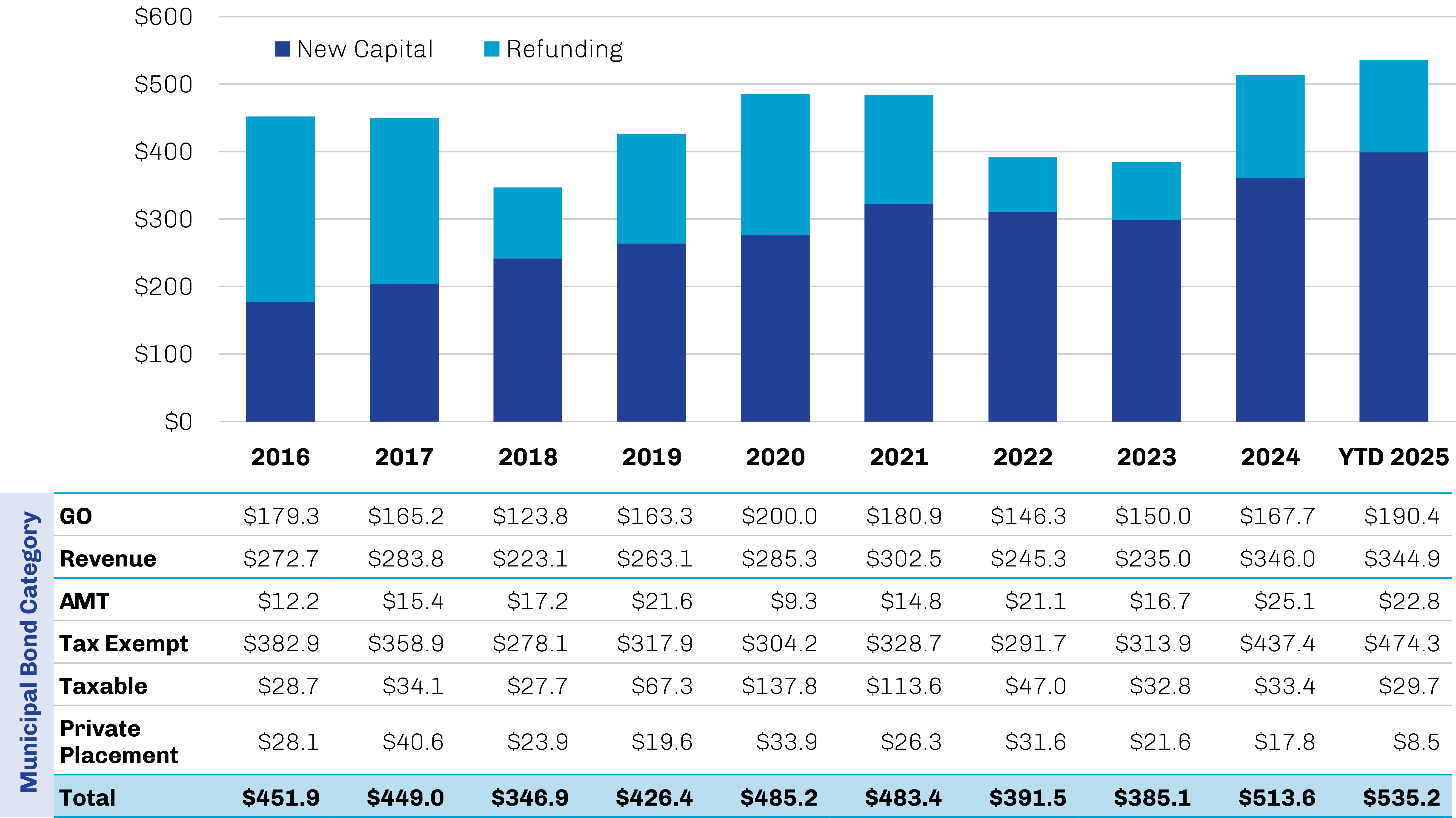 Since-dispelled concerns about potential changes to the tax-exempt status of municipal bond interest income may also have prompted issuers to lock in favorable tax treatment ahead of any potential changes. Though the One Big Beautiful Bill Act, as enacted in July, ultimately had no impact on the tax-exempt status of muni bonds, the leadup to the bill’s passage brought with it the usual concerns that adjustments could be afoot. While the issue arises from time to time, the exemption’s broad popularity among voters of all geographies, political orientations and income brackets is likely to limit the potential for future changes or restrictions, in our opinion.