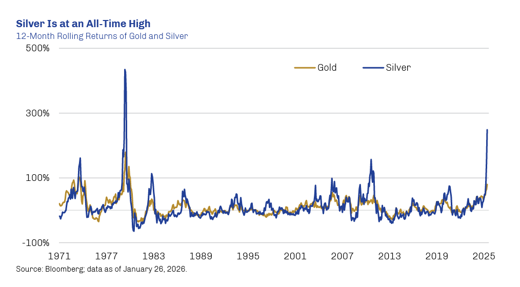 Gold hasn’t been the only beneficiary of this dynamic, as other precious metals have also broken out. Silver bullion, for example, gained 146% last year and its momentum has shown no signs of letting up in 2026.2 Silver historically has tracked the gold price in direction but with greater volatility given its industrial applications and lack of historical buying support from central banks. The outsized influence of futures trading on the price of silver has also contributed to its volatility.