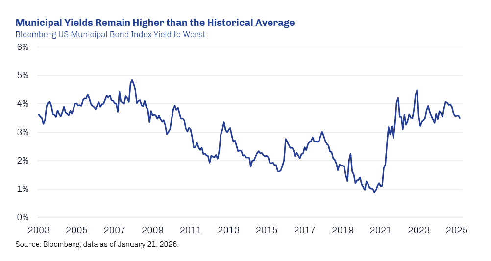 Muni yields are still attractive relative to their historical averages, in our view, and current dynamics provide particularly favorable conditions managers to uncover attractive opportunities through fundamental, research-driven credit selection.